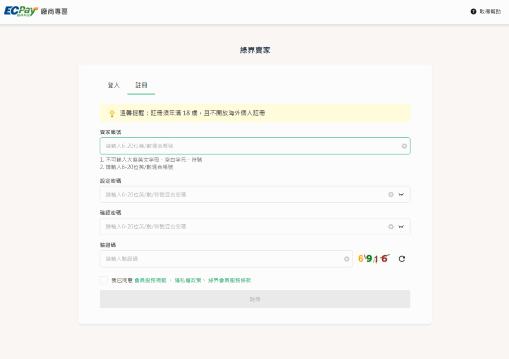 如果還不是綠界會員,也只需簡單填寫就可以快速免費註冊,就可以先建立賣場內容。 (圖片來源 : ECShop)