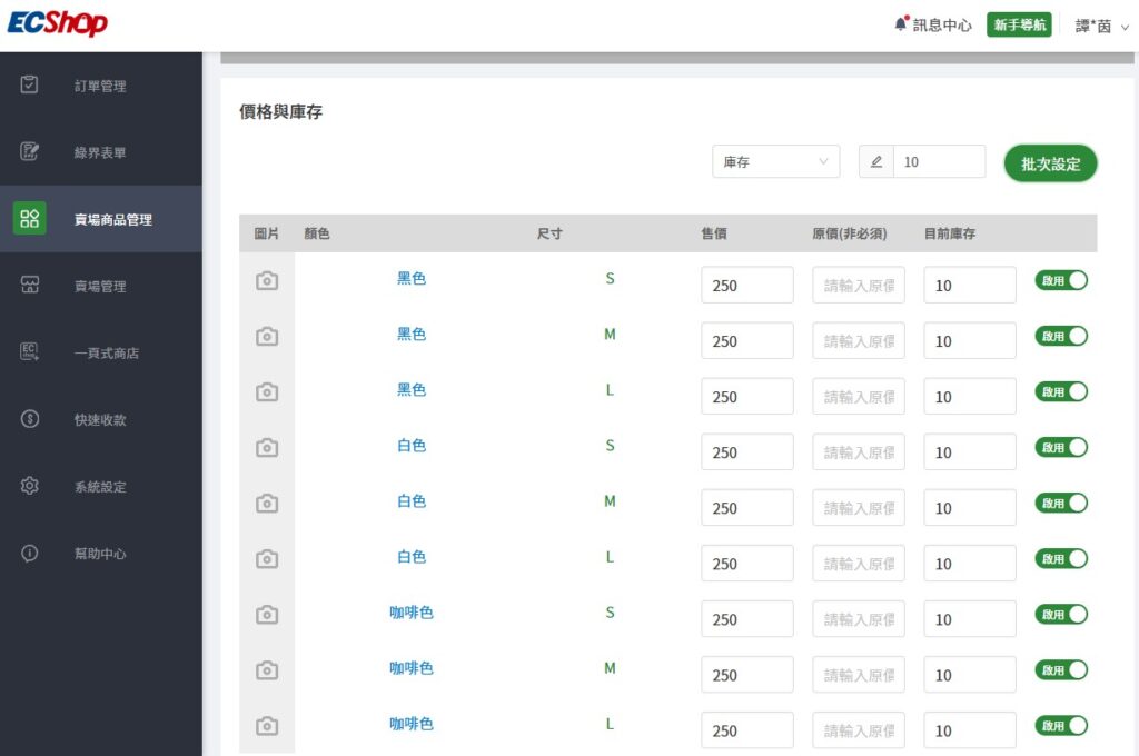 ECShop 設定規格後可分別別對規格進一步管理價格與庫存。 (圖片來源 : ECShop)