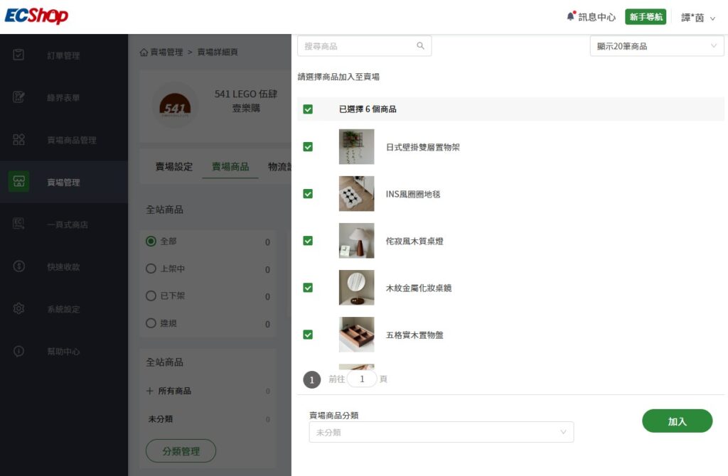 接下來要將步驟三上架的商品匯入到賣場當中!進入「賣場管理」→「加入商品」