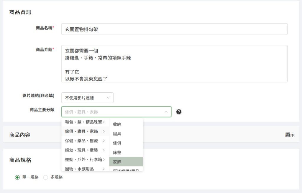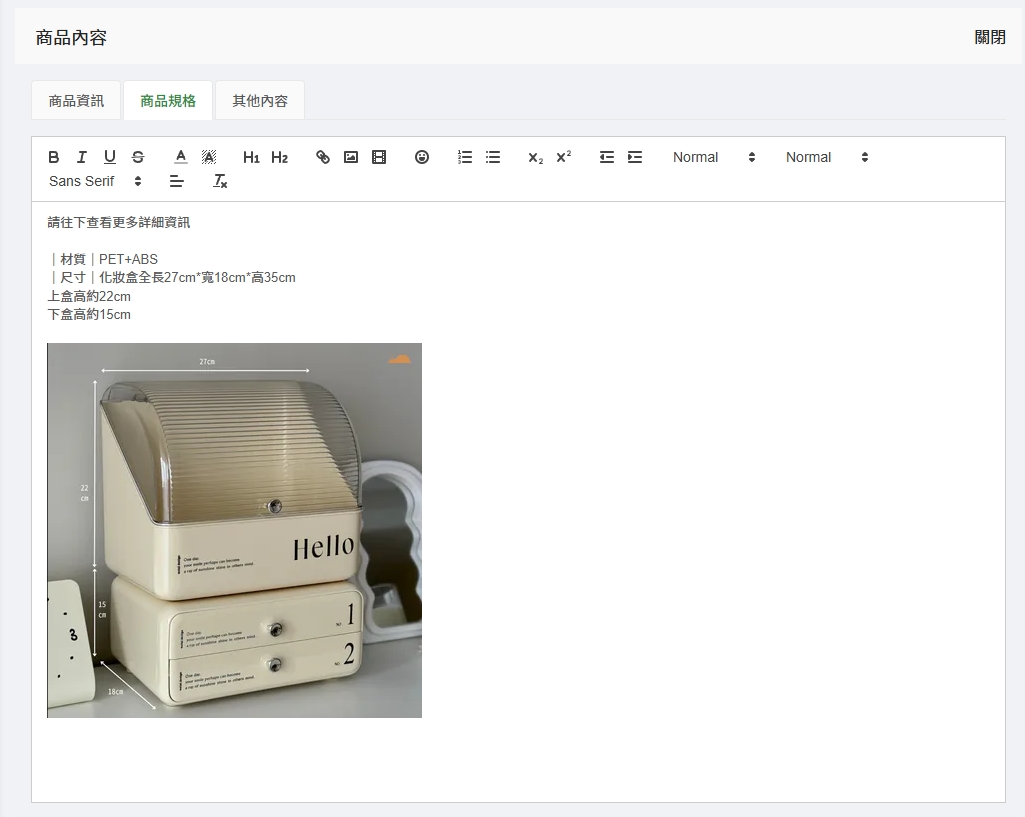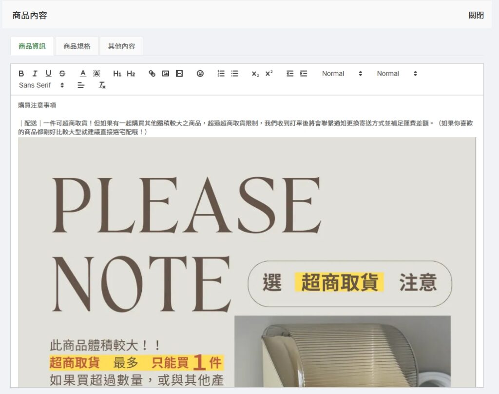 商品內容的欄位打開,可以分別在「商品資訊」、「商品規格」及「其他內容」的頁籤中補充更多商品的內容資訊!系統內建網頁編輯器,可以在裡面簡單編輯排版文字以及置入圖片、影片等素材。