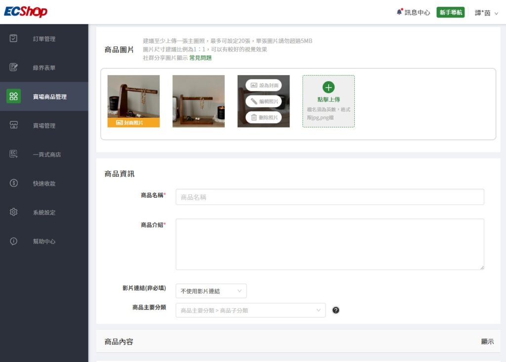 在左側選單中選擇「賣場商品管理」→「+新增商品」,不需要任何程式語言,只要填寫商品名稱、價格、描述,並上傳圖片即可完成。