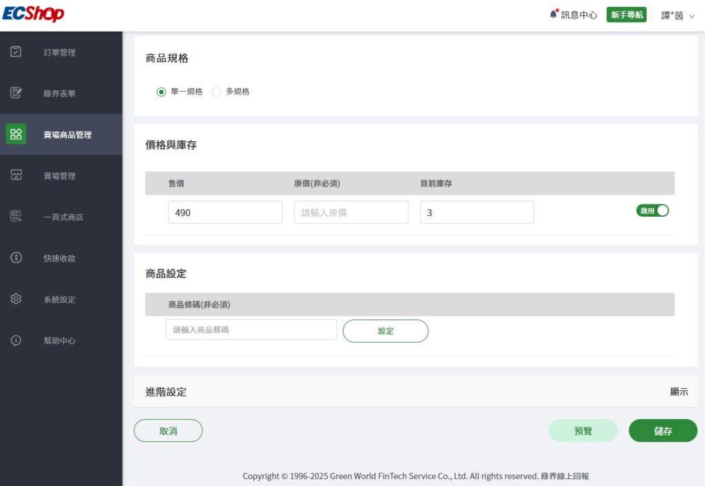 步驟四:設定商品多規格與庫存
