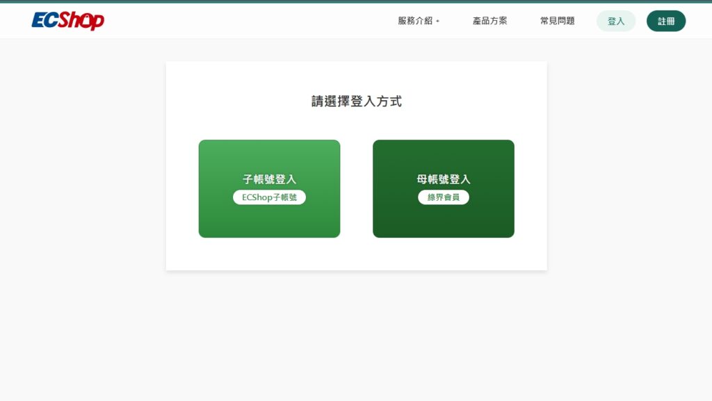 如果已經是綠界會員,點「母帳號登入」可直接用綠界帳號登入 ECShop 後台。子帳號登入則是綠界會員母帳號想要讓公司員工可以登入賣場管理訂單,可以額外進行子帳號設定後,給員工登入後台的使用入口。