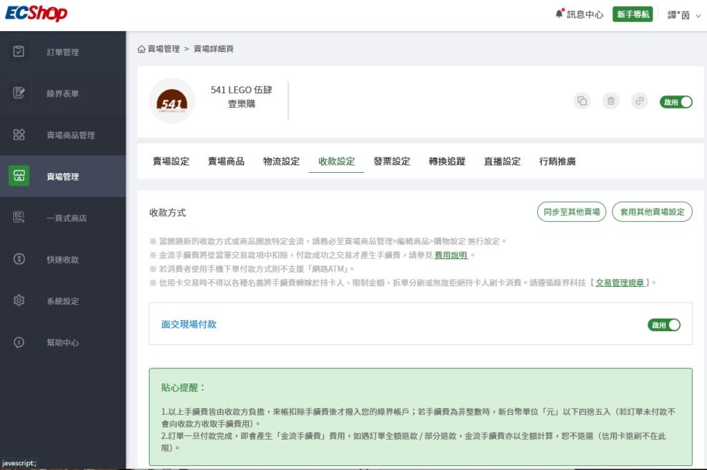 ECShop 在收款設定終將面交選項與賣場啟用開啟 (圖片來源 : ECShop)