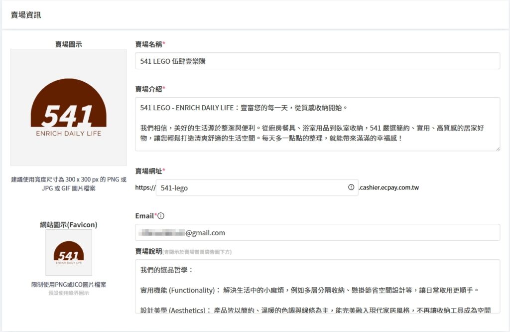 將你的品牌名稱、賣場說明、賣場識別網址、客服聯絡信箱與Logo等資訊設定到賣場中。