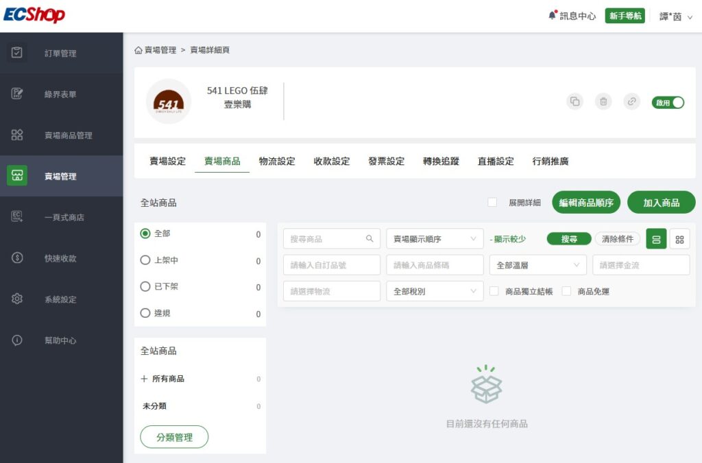 所有賣場功能都列在左側選單中。